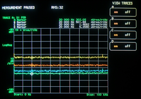 そして出力をFFTアナライザのパワースペクトル密度モードで測れば終わりです.入力換算雑音値を求めるには計測値をアンプのゲインで割ります.