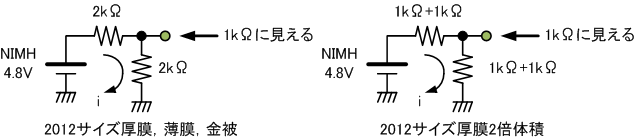 実験は1kΩの電流雑音を計測しました.超低雑音のニッケル水素電池から2個直列の2kΩに電流を供給します.計測は抵抗の中点からでテブナンの定理によって1kΩを測ったことになります.厚膜1kΩの4個直列は体積を2倍するためのものです.