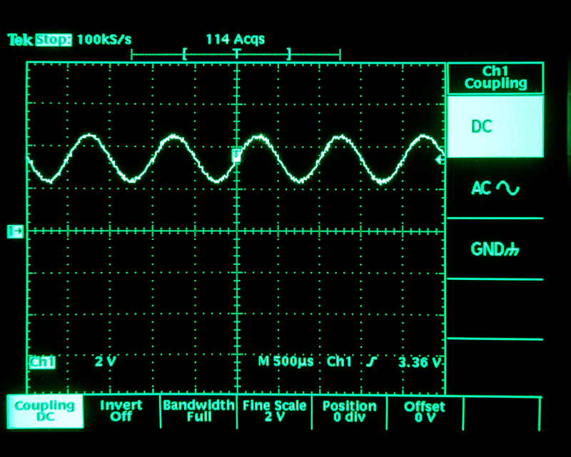 回路は図1の簡単な自己バイアス式です。ご覧の様に簡単に動きました。写真2は1kHzの正弦波での波形で、写真3は方形波です。写真を撮り忘れましたが、HP8131Aによる超高速方形波でも波形崩れすることなくとても綺麗でした。