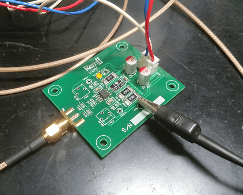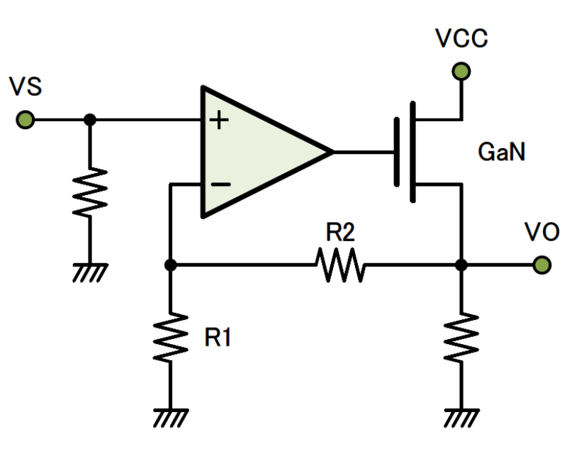 次にOPアンプとGaNを図1の様に組み合わせました。そのための専用基板も作りました。写真1参照。