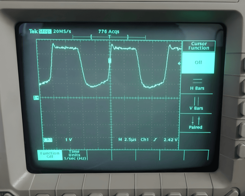 何故、高速系OPアンプではダメなのかを探るべく、安定に動くOP184と組み合わせて、方形波信号によるゲート波形を観測しました。すると正方向ではいかにも駆動しているという感じですが、負方向ではGaNがOFFし、自然に電圧が下がるのを待っているのです。つまりNFループが切れる瞬間が生じてこれで発振していたのです。写真3参照。
