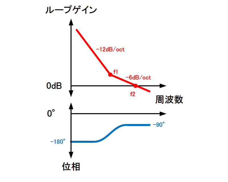 2ポール位相補正によるアンプ設計は、f1とf2を決めるだけで簡単に設計することが出来ます。ポイントはf1とf2は最低でも5倍以上離すことです。
