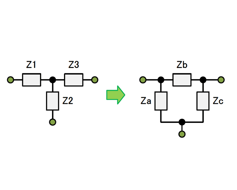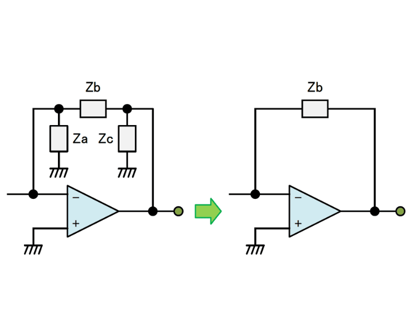 図2の2段目の帰還回路は、そのままキルヒホッフで解くことが出来ますが結構面倒です。そこで図3の様にY→Δ変換します。そしてZaとZcは省略可能なので最終的に図4のZbだけが残ります。さてそのZbですがY→Δの変換公式(省略)から式1となります。