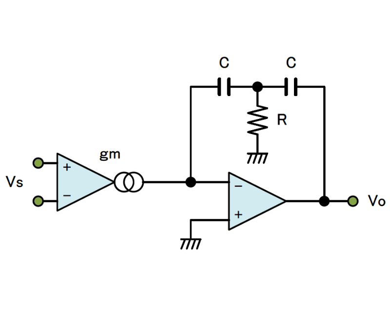 V_o=g_m\cdot\frac{1}{2\pi f\left({\Large \frac{C}{2}}\right)}\cdot V_s