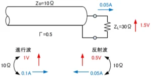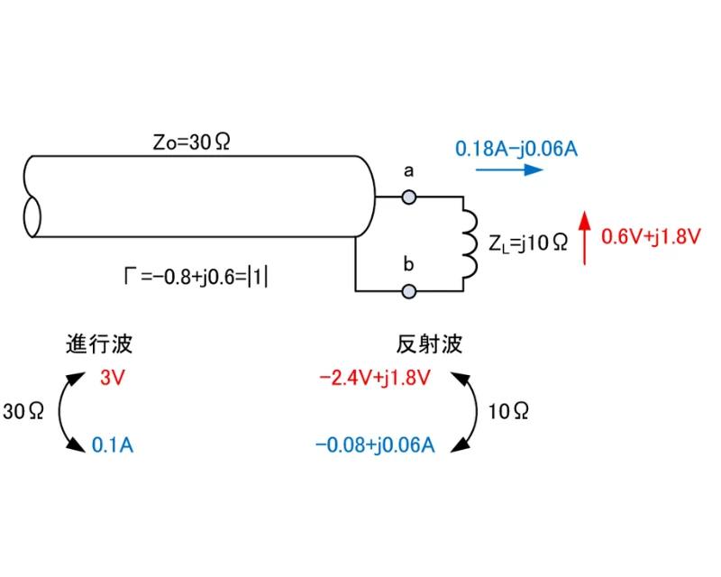 反射波の電流の向きを進行波基準にし、a-b間の電圧と電流を式5で求めると0.6V+j1.8Vと0.18A-j0.06Aになります。