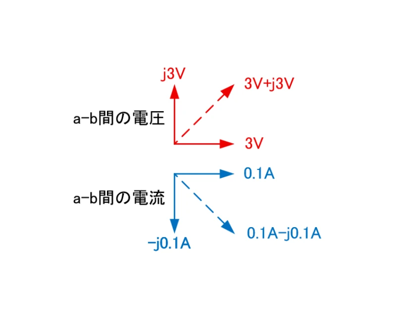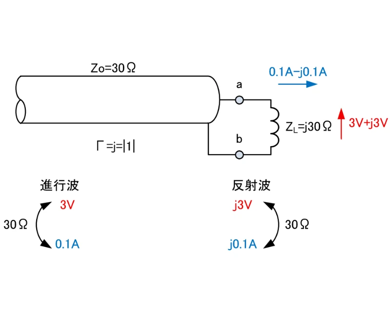 ここで進行波を3Vと0.1Aとした場合、反射波は式1に基づきj3Vとj0.1Aが算出されます。リアクタンス負荷に対する反射でありながら共にjを含み同相である事が興味深いです。 この反射波の電流j0.1Aですが、これは反射波としての正の方向でこれを進行波基準で考えるとマイナスになります。それらを踏まえてa-b間の電圧と電流は式2となります。そしてベクトルは図2になります。